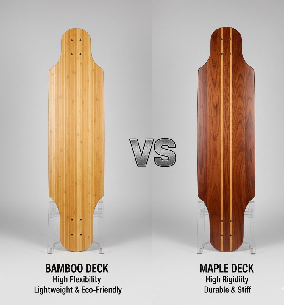A maple deck feels rigid and “dead,” while a bamboo longboard feels alive — a smooth, rhythmic pulse with every turn.